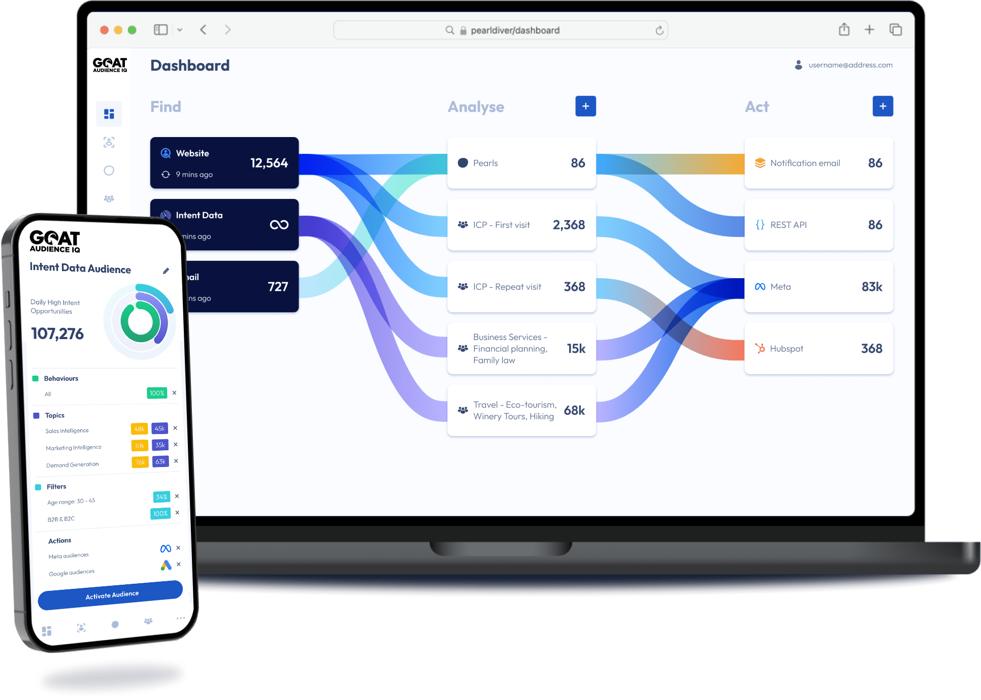 GOAT Audience IQ reveals who’s truly in‑market, builds ready‑to‑run audiences from billions of signals, and pushes them straight into your ads, CRM, and sales workflows.